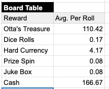 I started with the Archero 2 minigame template, with some small changes, to build the board, and first affirmed the expected dice roll reward per roll was less than one (i.e., the player won’t play for infinity).