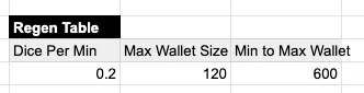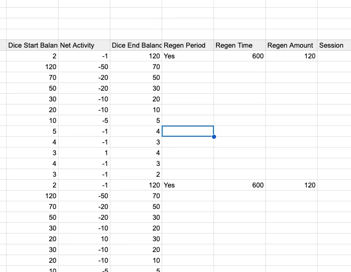 We’ll add a bunch of other derivative metrics that the model sets up, too. Since we have regen time, we can apply a “slack” rate or the percentage of missed Dice rolls players fail to expend. For example, if Dice regenerate at 100 per hour, a player could log in 24 times a day, perfectly one hour apart, to maximize the reward. The slack rate discounts this amount and implies the number of sessions a player will have per day.