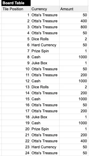 There are two: Otta Treasure Level and “Cash.” Both reward Dice rolls for collecting a certain amount of Treasure or Cash. We create look-up tables for all these values, putting in random number to play with and scale. The point of the timebox is to keep moving; good economy designers don’t get weighed down by certain assumptions, and polish later.