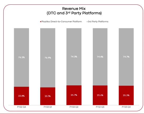 Laying growth in webstore revenue share reverses trends. Playtika reported 13% of revenue from webstores in Q2 2020, which has grown to 25% in FY23 Q4, a jump of 12% percentage points. 6 Applying a linear trend from 13% to 25% to reported revenue between Strategy and RPG tells a dramatically different story. Strategy revenue grows by 6% (nominally!) compared to a 15% decline, while RPG declines 12% compared to a 29% decline without a webstore adjustment.