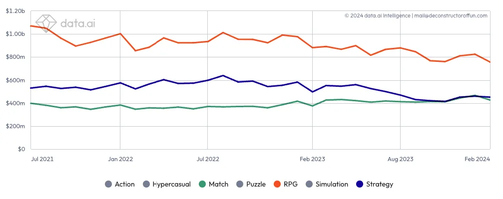 ATT reached a majority of iOS devices in Q3 of 2021, and it appears that midcore genres experienced a significant revenue decline while casual increased. RPG went from comprising 53% of the cohort’s revenue in January 2021 to 46% in Feb 2024, a drop of $250M per month, based on Worldwide revenue from iOS devices. The fall isn’t as grand as for “Strategy,” which dropped about $100M monthly between the two periods. The gains for Match are modest, about $30 per month, but it eclipsed “Strategy” for the first time in January.