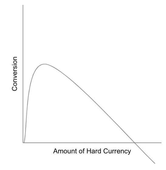 Consider a game economy with $500 in total spend. If we initially allocated $500 in hard currency to players, real money spend would drop to $0. Of course, no PM would suggest as much, but testing the endpoints helps form the shape of the optimality curve. Presumably, low levels of HC are needed to maximize conversion, but too much and conversion returns are negative. There is a global optimum somewhere in the early part of the curve; the amount of HC sourced here maximizes conversion.