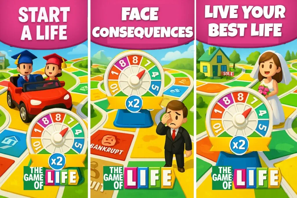 The Game of Life (GoLife) leverages what’s proven: wealth accumulation, a coop-competitive core, live ops tied to IP, and the board as the central action resolution centre. GoLife players flick a wheel, navigate a linear board, and encounter various life events like marriage, taxes, or even the lottery, all significantly impacting their virtual net worth. The game’s collections, loans, and investments are deeper economic mechanics than the original Monopoly, while maintaining similar core motivations.