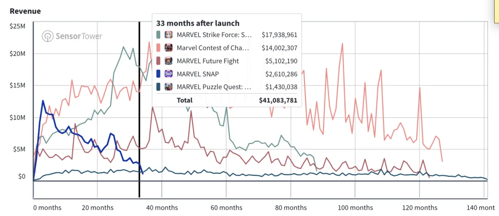Like many, I believe Marvel Snap is a magnum opus in CCG design, creating the first true mobile CCG. But the ultimate reality is that revenue collapsed. Thirty-three months after launch, it’s nearly the worst-performing Marvel game by revenue. The hypothesis of a sticky core hasn’t materialized as Sensor Tower estimates that active users have declined at a similar rate to revenue.