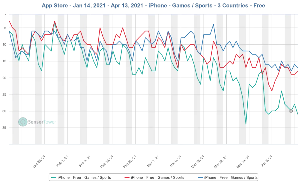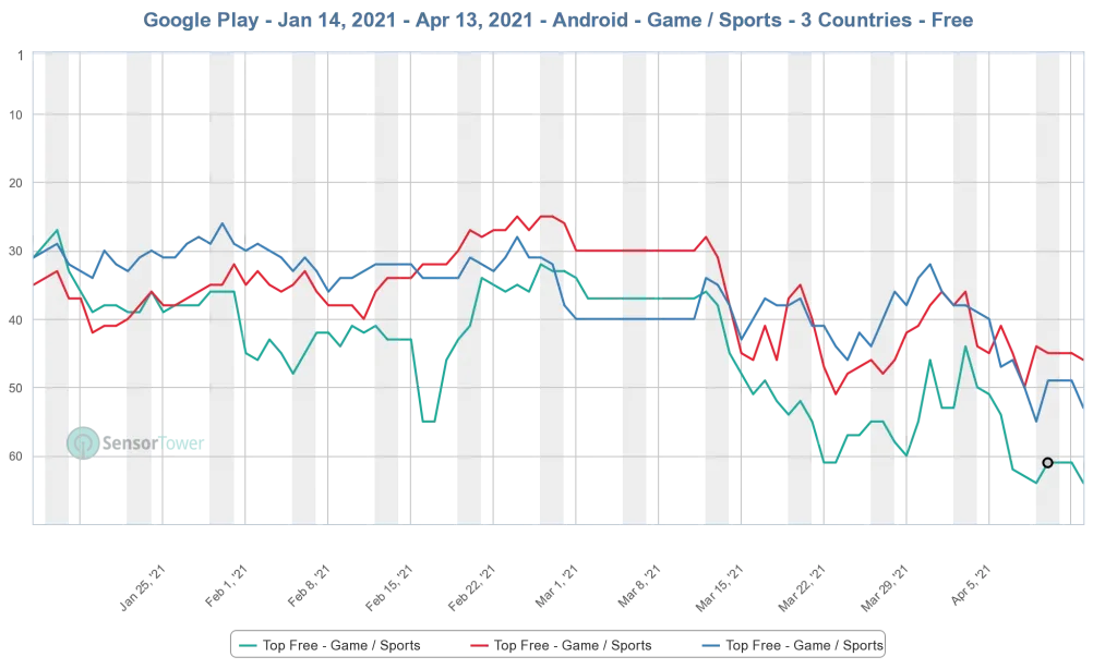 So where is the value if not in the simulation aspects of FIFA? Consider the explosion of FIFA Companion App downloads. The app lets owners buy and sell players from their mobile phones rather than a console. Based on store download rankings, it likely does north of 35M downloads per FIFA edition. Sensor Tower only provides the last 90 days of data, well after FIFA 20’s Oct 6th release, but we can still see how dominant it is in key countries.