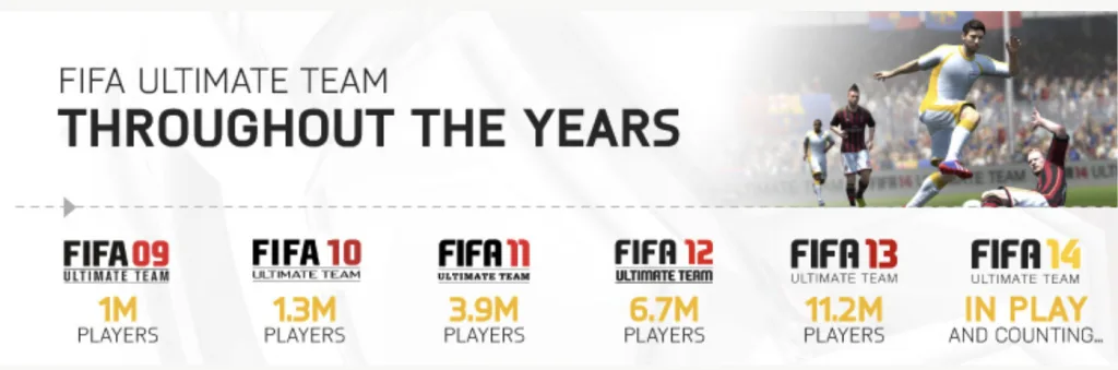 Who wouldn’t want a slice? Dominant leagues, however, maintain a moat: licensing. It’s been difficult to challenge FIFA since EA maintains a monopoly on simulation style football games with FIFA and many individual clubs. Konami and PES have faced bidding wars with EA and unsurprisingly the asset has gone its highest valued use (EA’s FIFA). But if you want a monopoly, you want it where the value is. I just think we’ve just misidentified the location. The “simulation” aspect of FIFA (i.e. control a player/team via joystick) is almost tangential to FIFA’s popularity. FIFA only became a monetization and engagement juggernaut after the release of UT. It started as paid DLC and long after FIFA’s initial release.