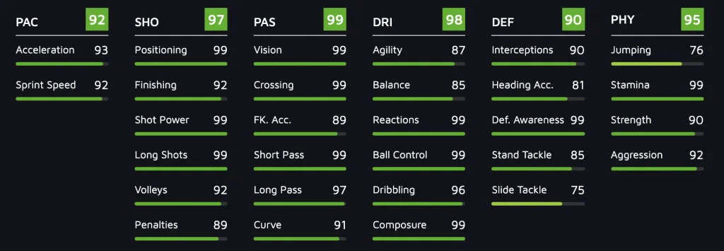Vertical progression or power progression means players earn more powerful and downside-free items overtime. Unlike, say, League of Legends where players earn different characters but the characters are intended to be equally powerful (horizontal progression). In Ultimate team, earning power is achieved by increasing the OVR of the team. Each player is tuned against a wall of stat dials, like this Kevin De Bruyne card.