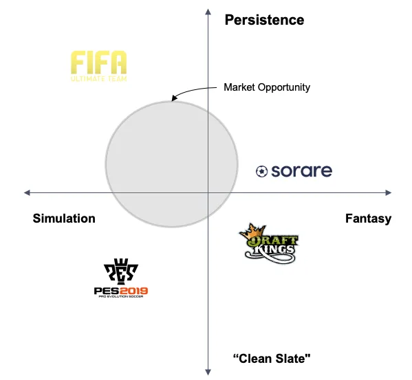 UT and fantasy sports are unique ways to engross fans in the world of sports. Markets, stakes, persistence, and skill progression are unique mechanics only found in games. Yet, we haven’t seen a sports game combine them in the right proportions. Sorare can be the first to do so. FIFA and fantasy sports are primed for a challenger; there’s a lot of pie to be won. But Sorare still has a ways to go. Oddly enough, monetization is solved for (auction house), engagement is a work in progress and acquisition is completely unproven. That’s the opposite of almost all start-up roadmaps. As the below chart suggests, the market opportunity will likely involve Sorare shifting a bit more up and to the left.