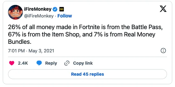 Fortnite realized this long ago, which is why the direct store has ballooned in content and uses “the vault” to sell past pass-specific content; the 67% direct store, 33% battle pass revenue split leaked from the 2012 Epic v. Apple trial likely skews harder direct store since.