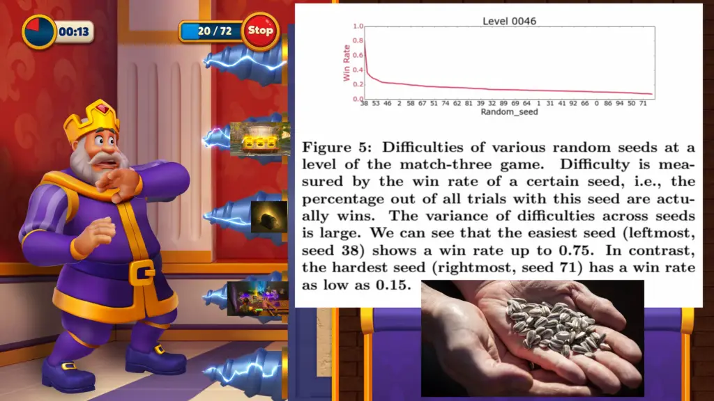Seeds are one of the most powerful variables in game design, and one of the least acknowledged. EA’s Data Science team published a paper showing a 5x difference in win rate—from 15% to 75%—based only on the seed used to initialize a board. The level design and other match parameters remained the same!