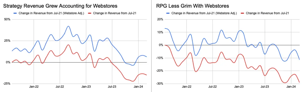Laying growth in webstore revenue share reverses trends. Playtika reported 13% of revenue from webstores in Q2 2020, which has grown to 25% in FY23 Q4, a jump of 12% percentage points. 6 Applying a linear trend from 13% to 25% to reported revenue between Strategy and RPG tells a dramatically different story. Strategy revenue grows by 6% (nominally!) compared to a 15% decline, while RPG declines 12% compared to a 29% decline without a webstore adjustment.