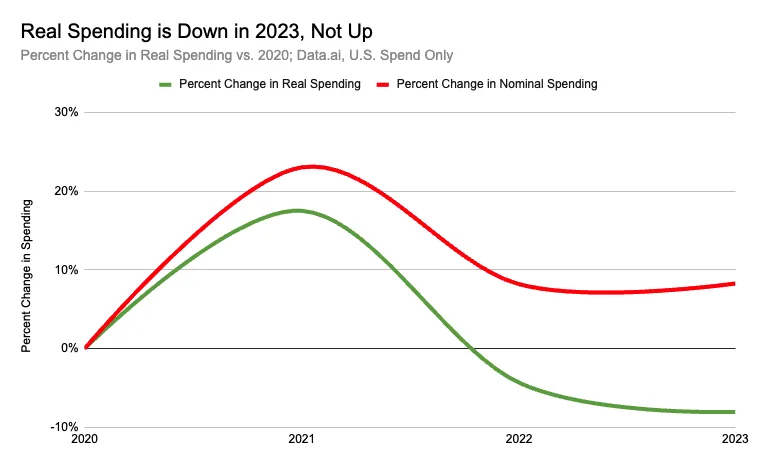 - Adjusting for inflation completely reverses the growth in mobile spending between 2020 and 2023, from +8% to -9%.