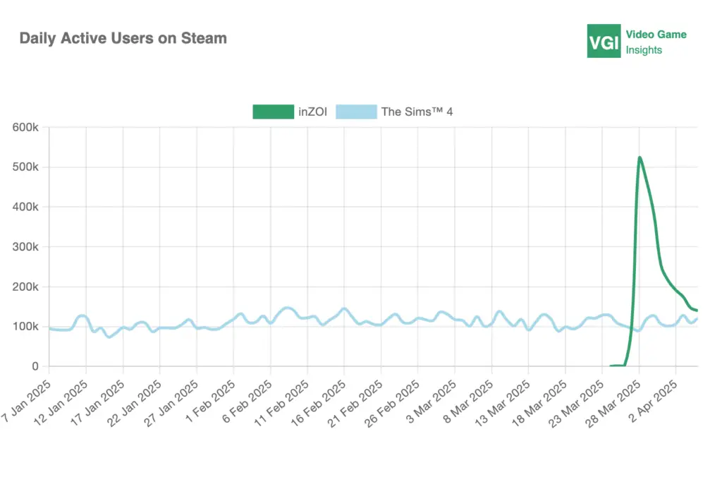 InZoi’s initial arrival has been good but not great so far. Initial estimates point to Steam revenue in the range of $35+ million, with Krafton stating it sold than one million units. However, retention is slipping, and active users are converging on The Sims’ Steam figures. So far, there’s been zero Sims PSU impact, unlike something like the meator Marvel Rivals left on Overwatch 2’s numbers.
