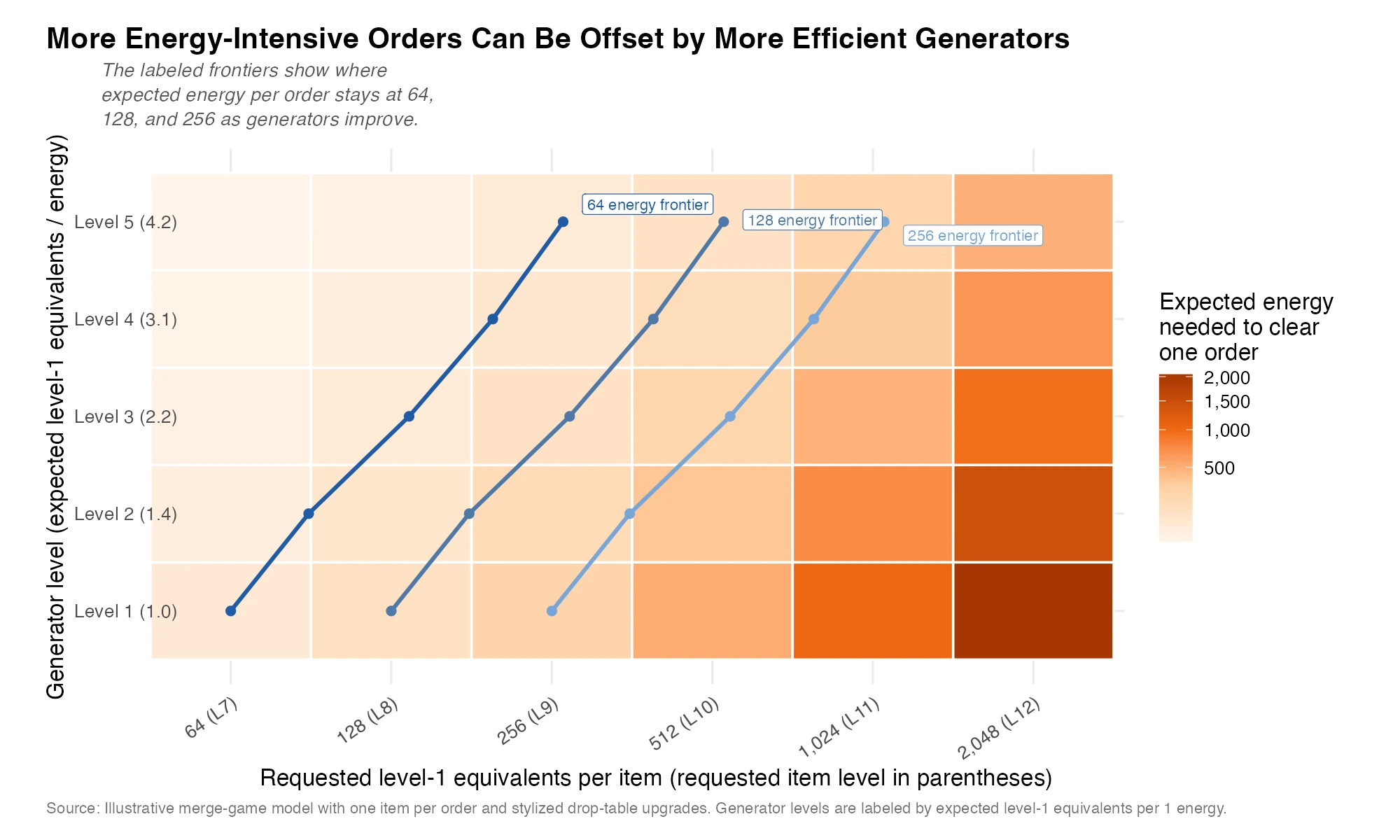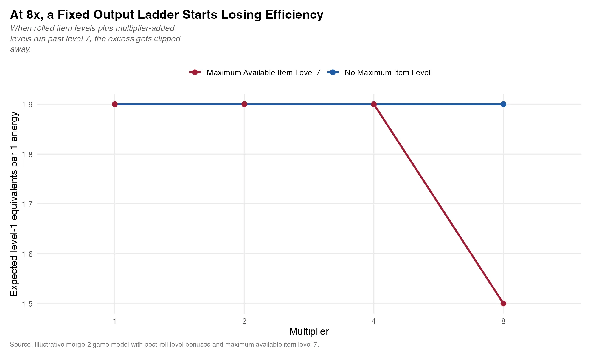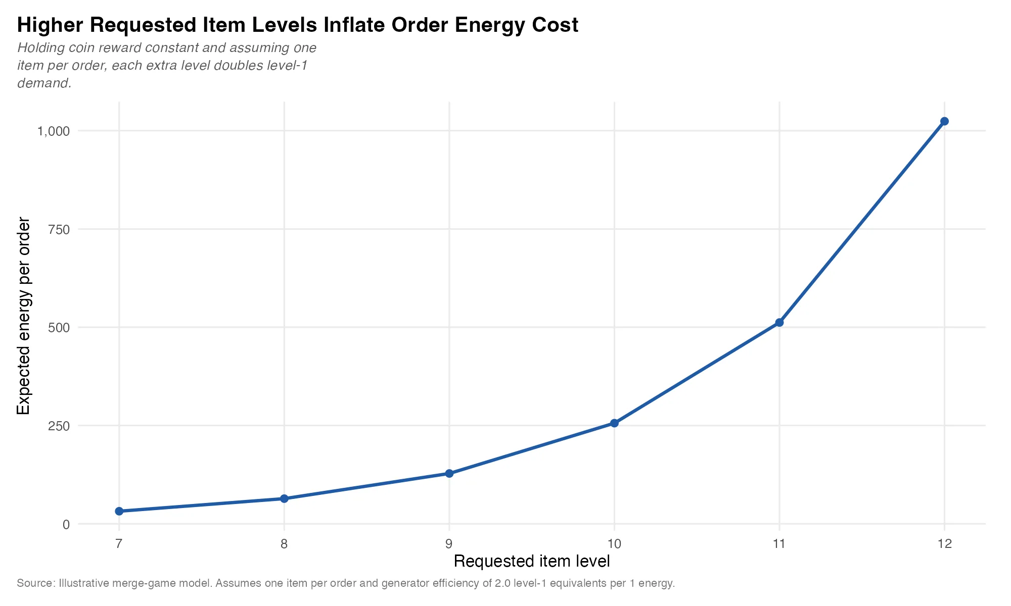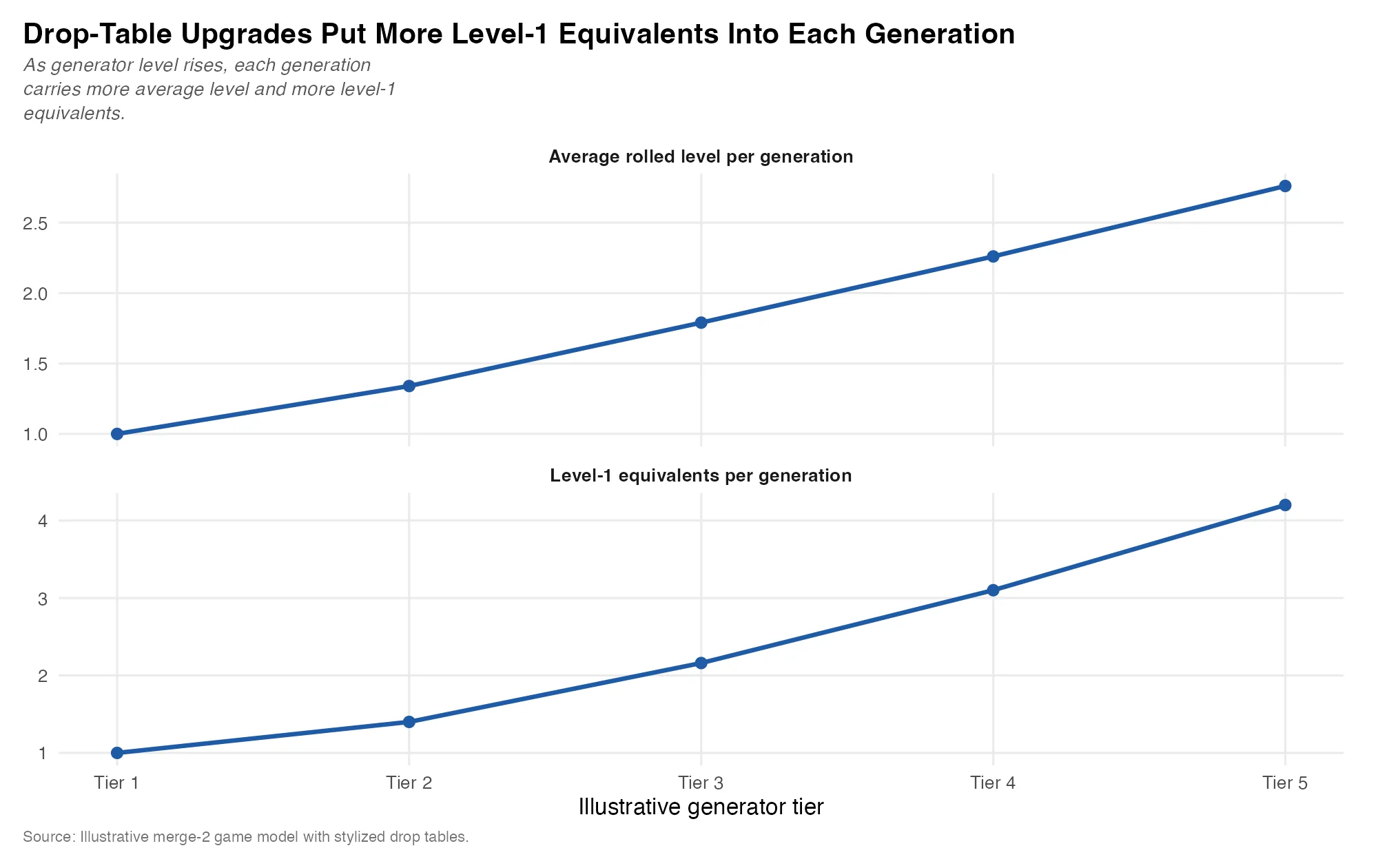Pinning one level-1 item to one energy is a foundational merge-economy design choice. If higher generator levels raise the expected number of level-1 equivalents per unit of energy spent, then the economy gains a long-run efficiency layer. These are permanent generator-efficiency upgrades. It is a huge risk for designers to change this, since it affects the player's entire lifecycle: the board doesn't reset like in match-3. Ever.
