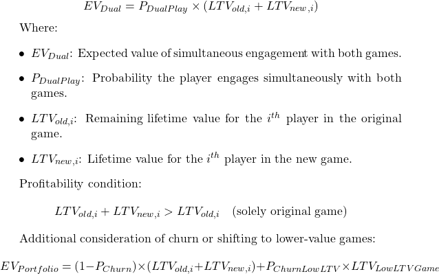Here, the probability of simultaneous engagement represents the remaining LTV in the existing game for the ith player, and is the new game’s LTV for the same player. To justify dual-game investment, this combined LTV must surpass the potential LTV had the player remained solely in the original game. It is possible to decrease portfolio LTV by shifting players to a lower LTV game (my poor Squadbusters)!