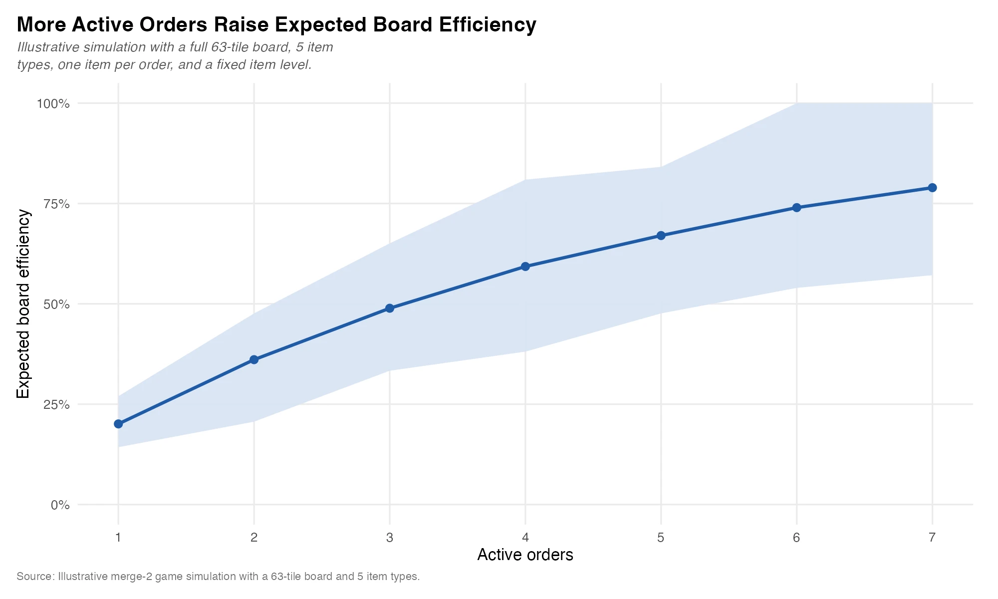 The board size is 9 x 7 or 63 tiles. If we assume one item per order, fix the item order level, set the number of distinct item types to 5, and assume all 63 tiles are occupied by items, we can show how additional orders increase board efficiency.