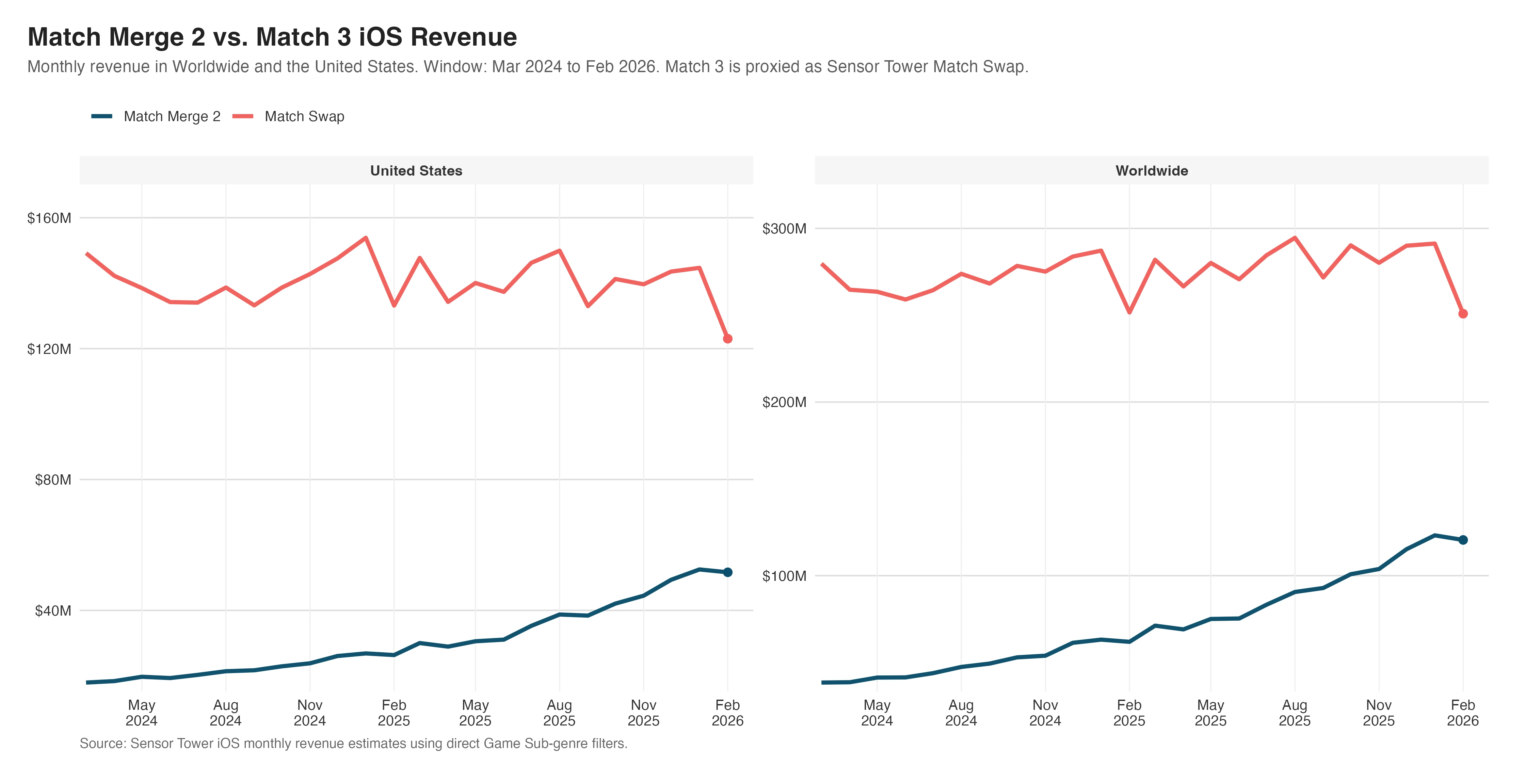 That is an important market structure. It suggests the next wave of Match Merge 2 competition is less about whether the genre has proven product-market fit and more about which publisher ecosystems can best translate global production into products that monetize with the United States consumer. This is an iOS-only cut, Match 3 is proxied here with Sensor Tower's Match Swap subgenre, the publisher-country chart is built from the current cohort rather than a historical point-in-time cohort, and the grouped release chart excludes titles whose publisher region is unknown. Even with those caveats, the directional story is hard to miss: global supply, American demand center.