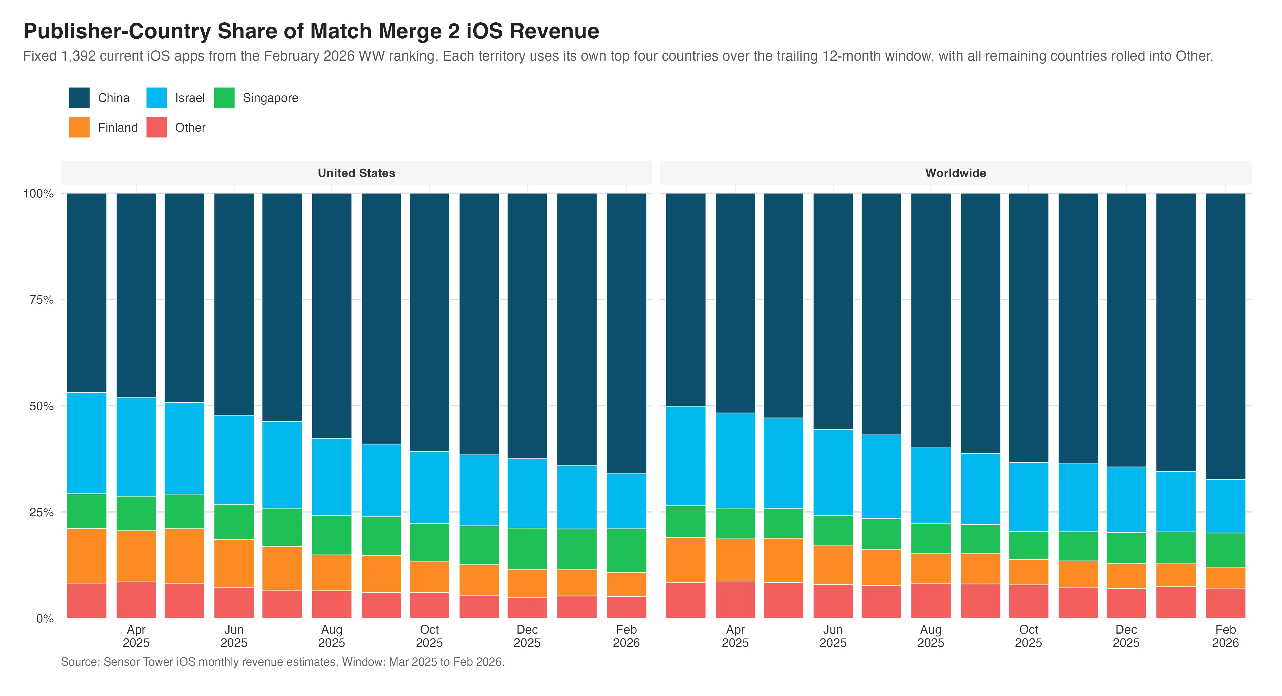 What is striking is that the firms capturing that revenue are mostly not American. Over the last 12 complete months in this fixed iOS cohort, China captured about 58% of United States Match Merge 2 iOS revenue, Israel about 18%, Singapore about 9%, and Finland about 9%. By the latest month in the cut, China alone represented about 66% of United States revenue and about 67% of worldwide revenue. So the genre's demand center is the United States, but much of the supply-side execution is coming from overseas publisher bases.